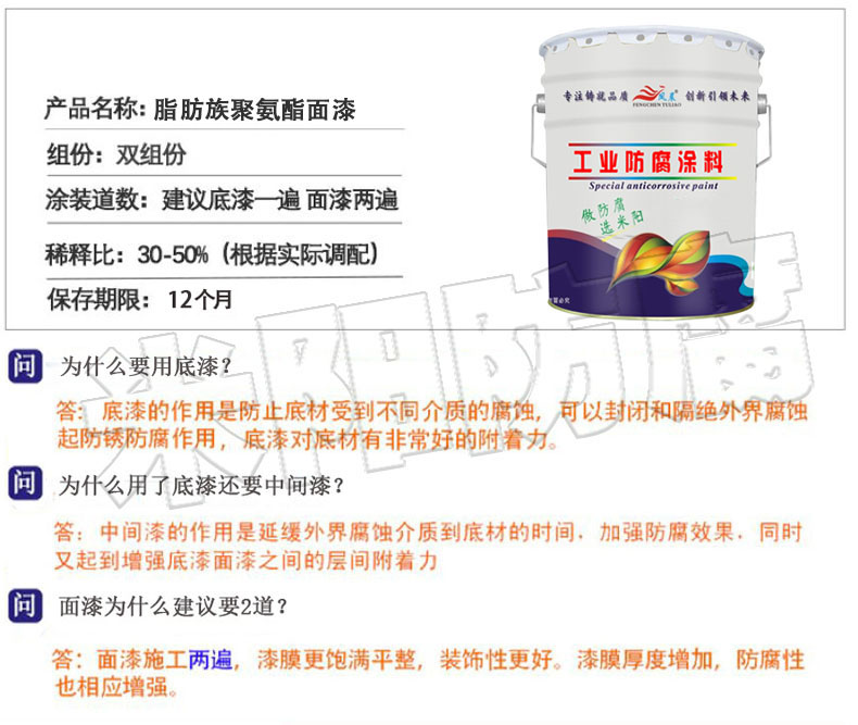 脂肪族聚氨酯面漆別名脂肪族聚氨酯防腐漆,為雙組份,其組成如下:
